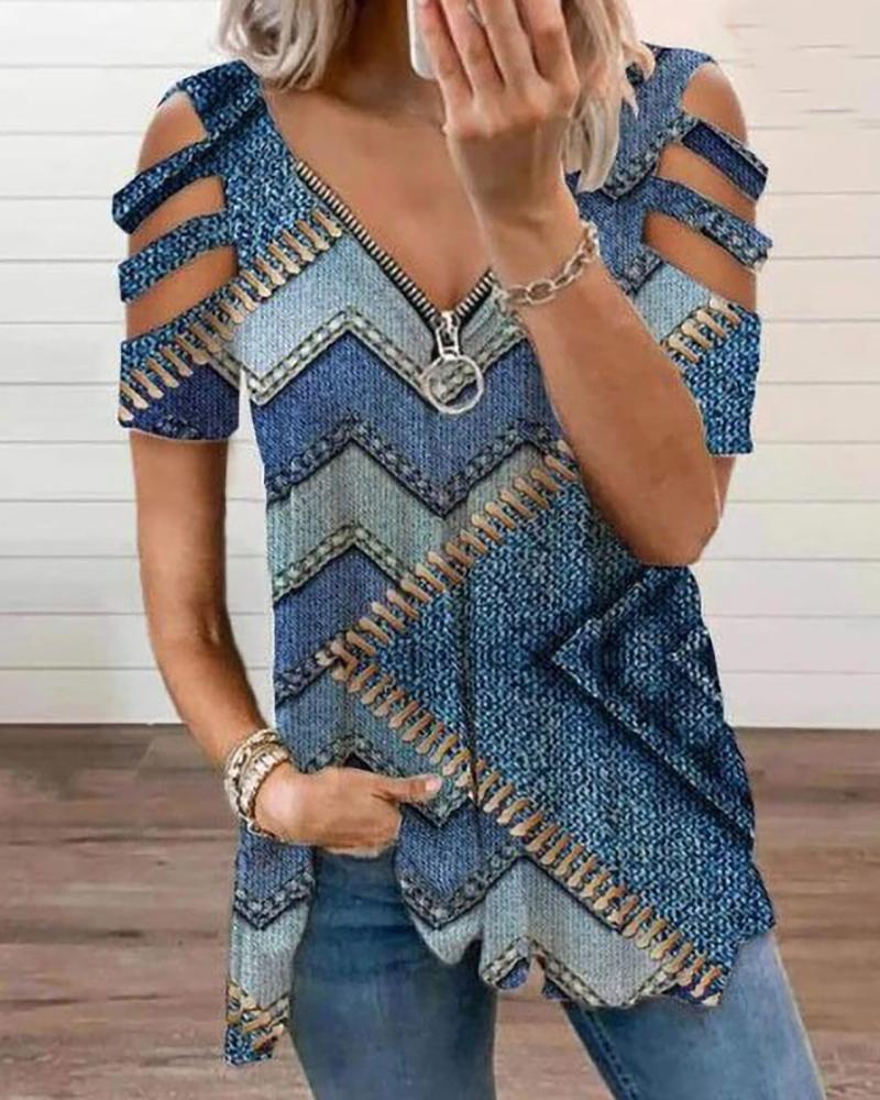 Style:Chic Type:Tee Material:95%Polyester,5%Elastane Neckline:Cold Shoulder,V-Neck Sleeve Style:Short Sleeve Length:Regular Pattern Type:All Over Print Decoration:Cutout,Zipper Fit Type:Regular Occasion:Daily Package Include:1*T-Shirt