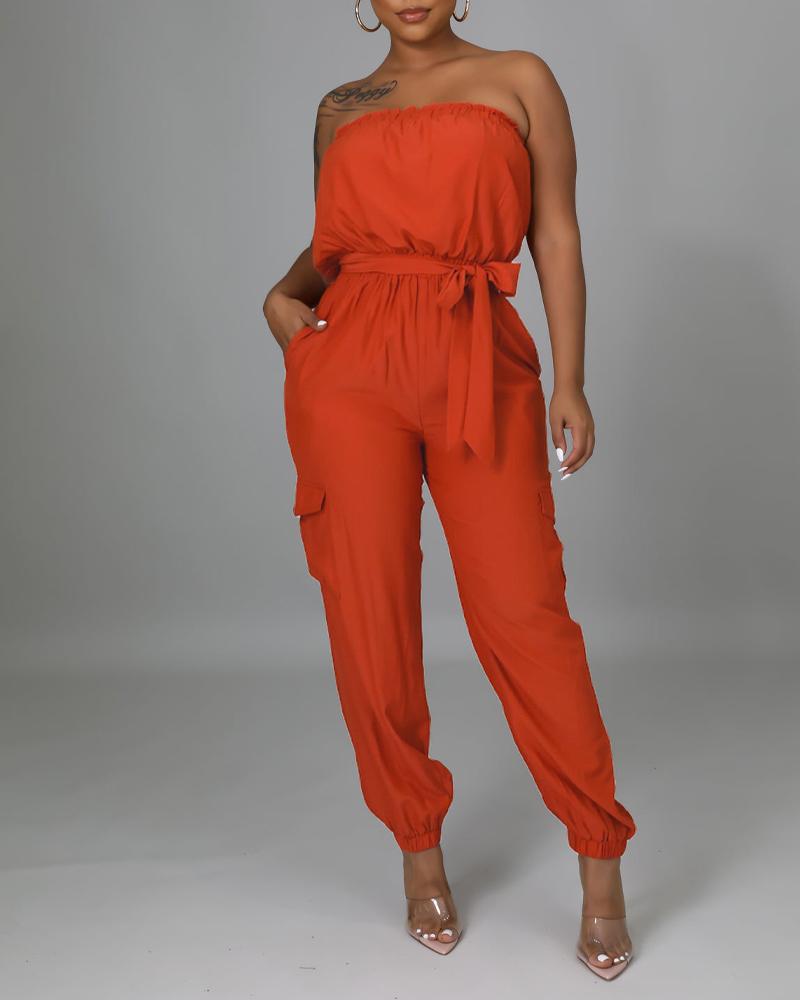 Style:Casual,Chic Type:Jumpsuit Material:Polyester Neckline:Bandeau Sleeve Style:Sleeveless Length:Long Pattern Type:Plain Decoration:Frill Hem,Pocket Fit Type:Regular With Belt:Yes Occasion:Daily Package Include:1*Jumpsuit (With Belt)
