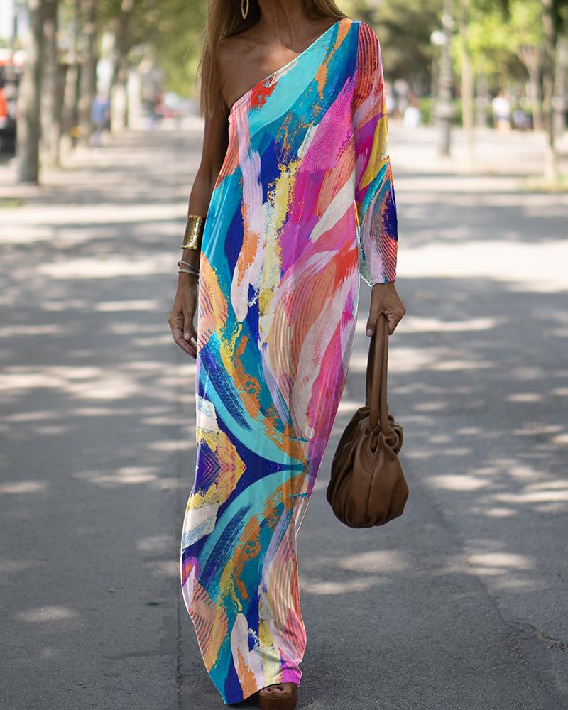 Style:Chic Type:Straight Material:Polyester Neckline:One Shoulder Sleeve Style:Long Sleeve Length:Maxi Pattern Type:Abstract Fit Type:Regular Occasion:Daily,Vacation Package Include:1* Dress