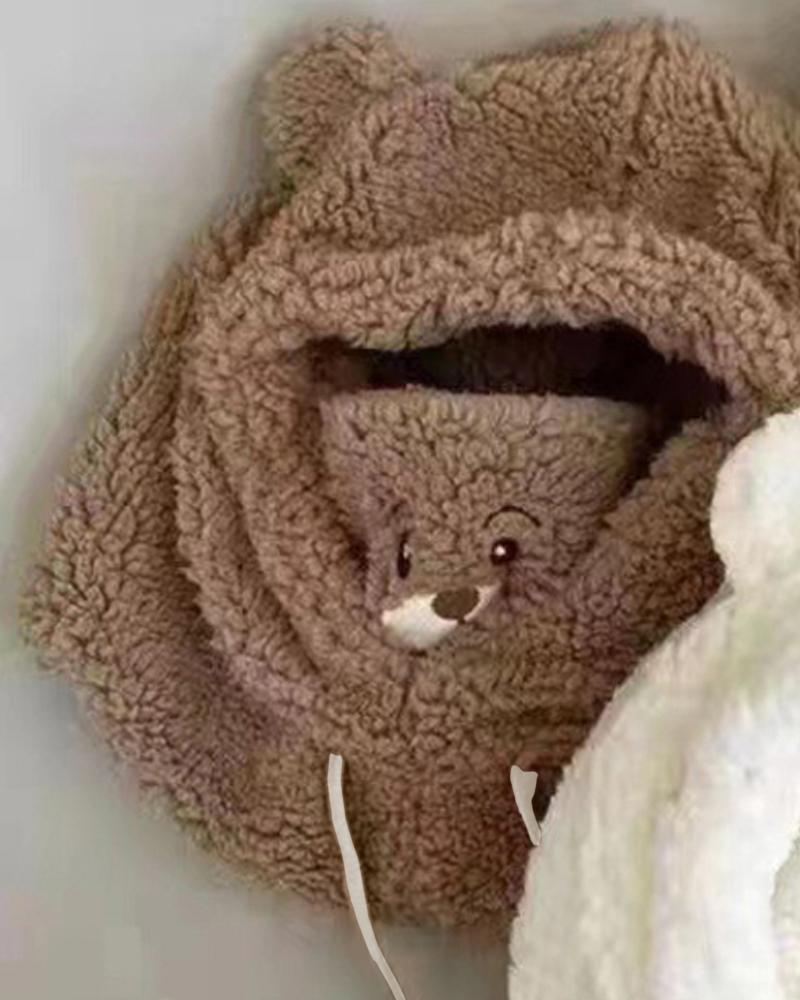 1pc Embroidery Cute Bear Fluffy Beanie Hat Scarf Mask Neck Warmer Set Drawstring Warm Hooded Winter Balaclava Pullover Hats