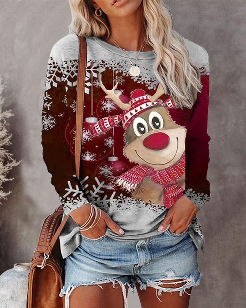 Christmas Snowflake Elk Print Long Sleeve Casual Top