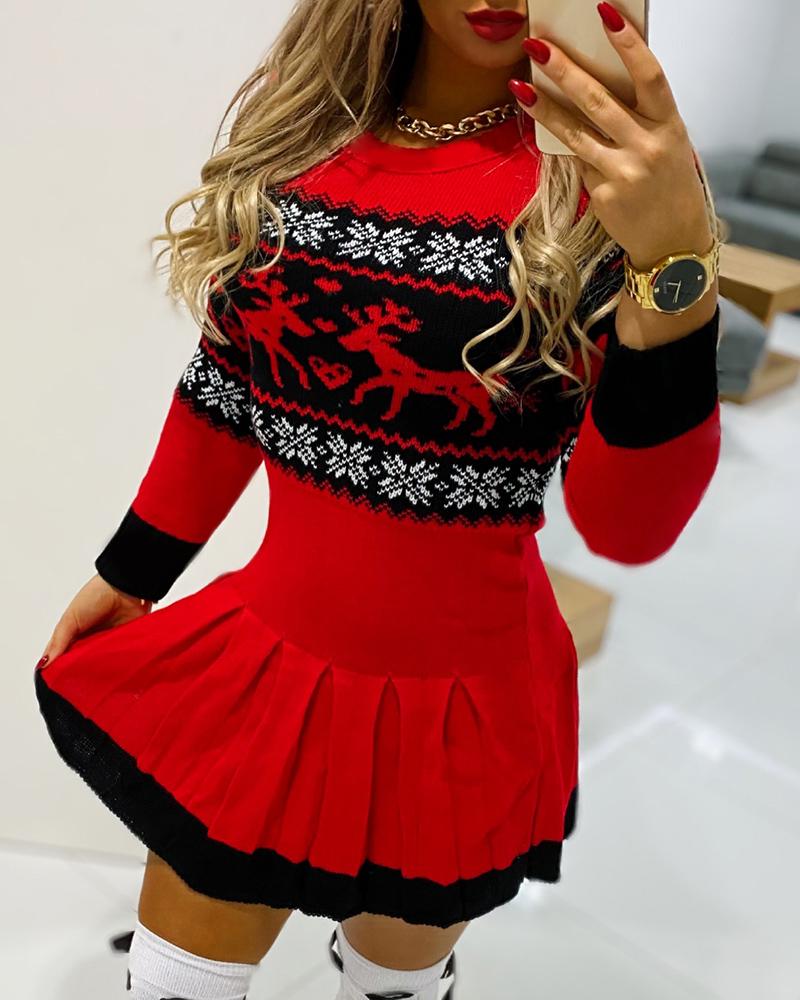 Christmas Reindeer Print Long Sleeve Pleated Dress