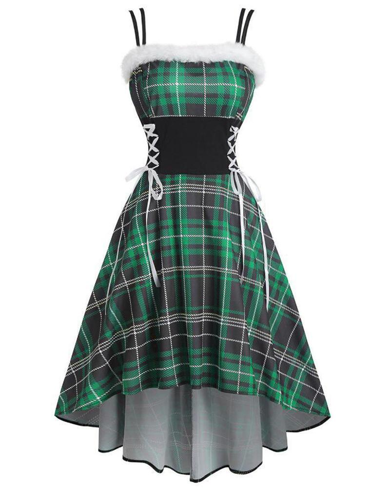 Christmas Plaid Print Lace-up Fuzzy Trim Ruched Dress