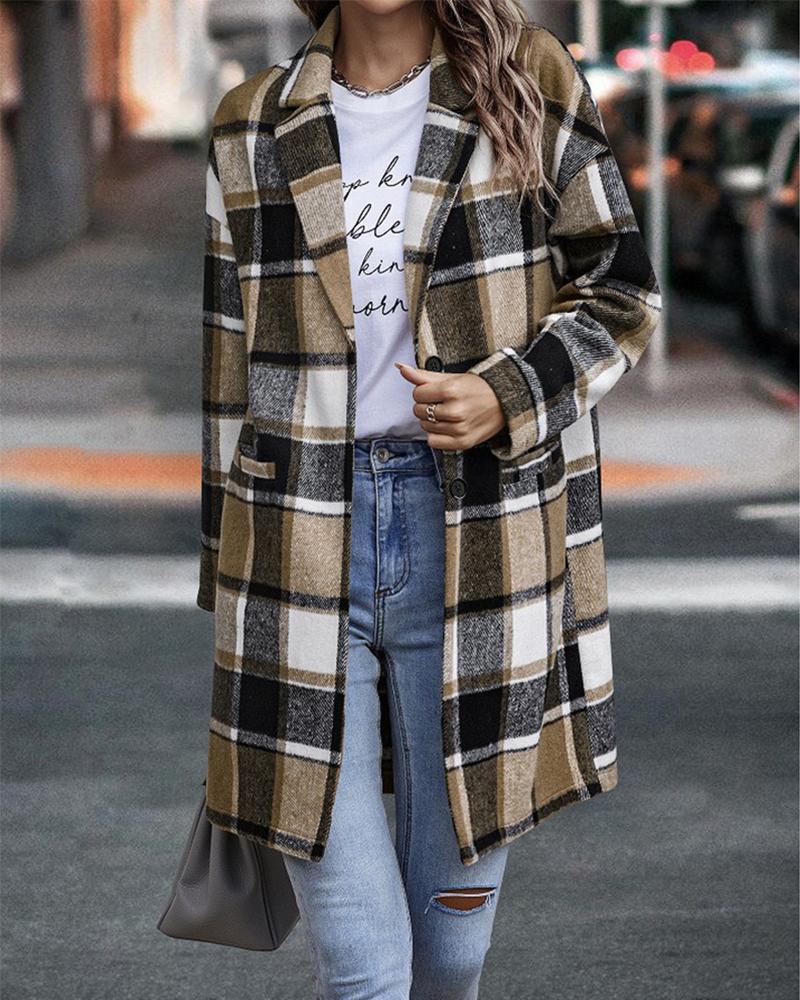 Style:Casual Type:Coat Material:Polyester Neckline:Notched Collar Sleeve Style:Long Sleeve Length:Long Pattern Type:Plaid Decoration:Button,Pocket Fit Type:Regular Occasion:Daily Package Include:1*Coat