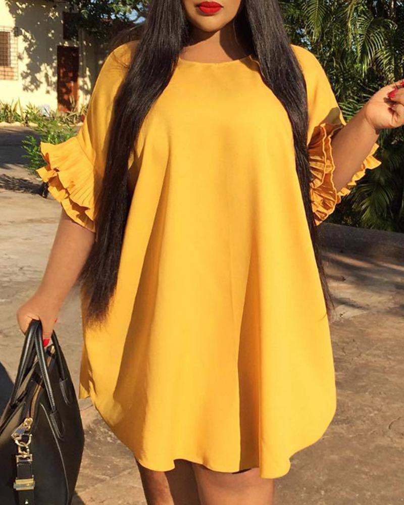 Style:Casual,Chic Type:Straight,Tee Material:Polyester Neckline:Round Neck Sleeve Style:Bell Sleeve,Half Sleeve Length:Mini Pattern Type:Plain Decoration:Bell Sleeve,Ruffles Fit Type:Oversized Occasion:Daily Package Include:1* Dress