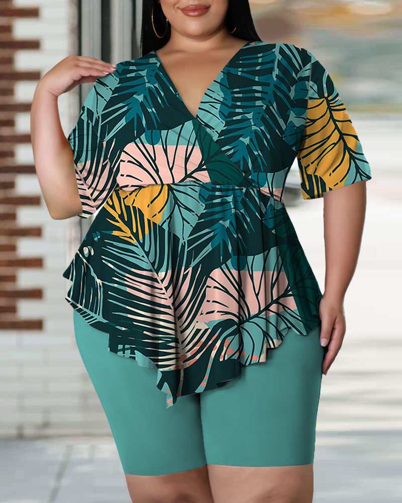 Plus Size Tropical Print Asymmetrical Hem Top & Shorts Set