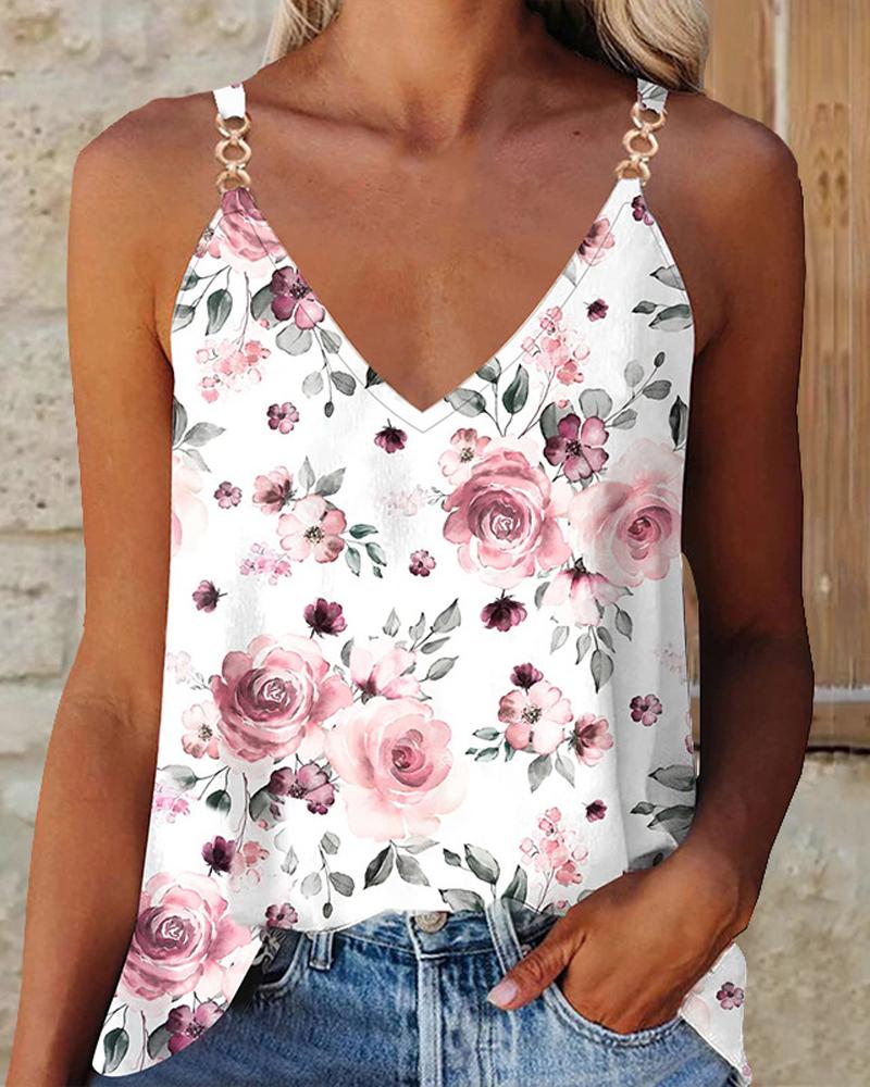 Style:Casual,Chic Type:Cami Material:Polyester Neckline:V-Neck Sleeve Style:Sleeveless Length:Regular Pattern Type:Floral Decoration:Chain Fit Type:Regular Occasion:Daily,Vacation Package Include:1*Top