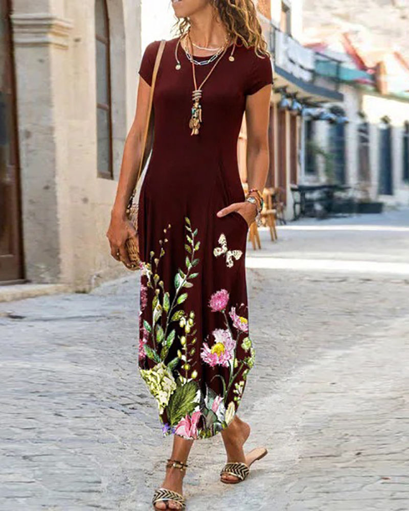 Style:Basics,Casual Type:Tee,Straight Material:Polyester Neckline:Round Neck Sleeve Style:Short Sleeve Length:Mid-Calf Pattern Type:Floral Decoration:Pocket Fit Type:Regular Occasion:Daily,Vacation Package Include:1* Dress