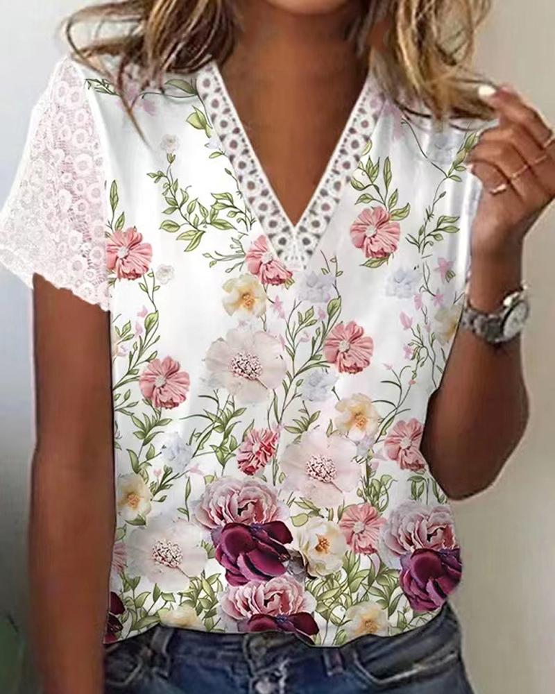 Style:Casual Type:Regular Material:Lace,Polyester Neckline:V-Neck Sleeve Style:Short Sleeve Length:Regular Pattern Type:Floral Decoration:Contrast Lace Fit Type:Regular Occasion:Daily Package Include:1*T-Shirt