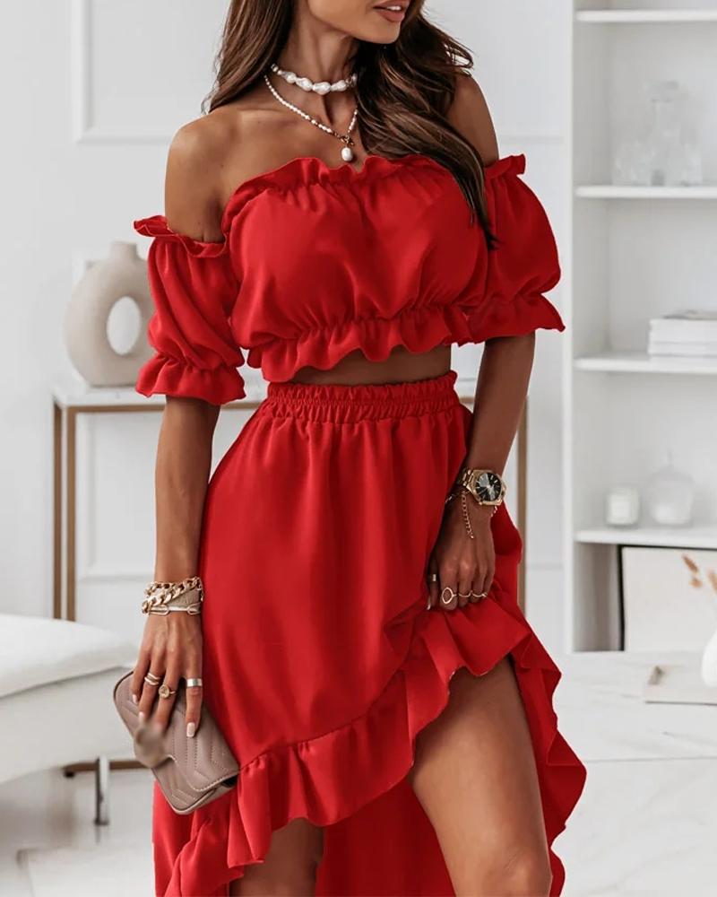 Off Shoulder Crop Top & Ruffles Dip Hem Skirt Set
