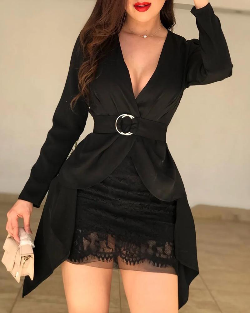 Style:Chic,Elegant Type:Skirt Sets Material:Polyester,Lace Neckline:V-Neck Sleeve Style:Long Sleeve Length:Mini Pattern Type:Plain Decoration:Contrast Lace,Ruched Fit Type:Regular Occasion:Daily,Work Package Include:1* Skirt Set
