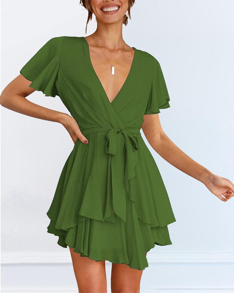 Style:Casual,Chic Type:A Line,Wrap Material:Polyester Neckline:V-Neck Sleeve Style:Flutter Sleeve,Short Sleeve Length:Mini Pattern Type:Plain Decoration:Flutter Sleeve,Ruffles,Zipper Fit Type:Regular With Belt:Yes Occasion:Daily,Vacation Package Include:1*Dress(With Belt)
