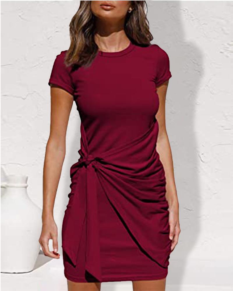Style:Casual,Chic Type:Straight,Tee Material:Polyester Neckline:O-neck Sleeve Style:Short Sleeve Length:Mini Pattern Type:Plain Decoration:Pastel,Tied Detail Fit Type:Regular Occasion:Daily Package Include:1* Dress