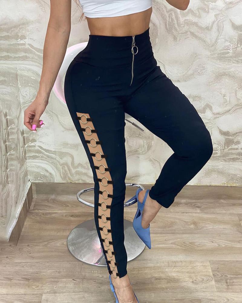 High Waist Zipper Design O Ring Skinny Pants