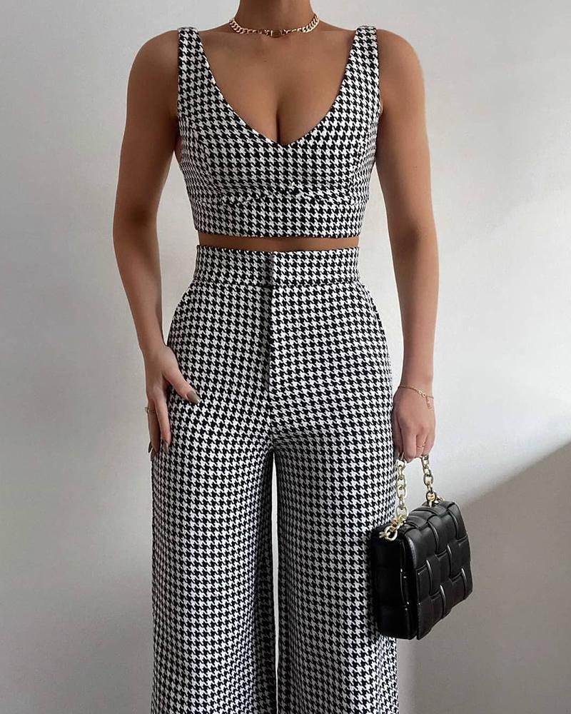 Houndstooth Print Crop Tank Top & High Waist Pants Set