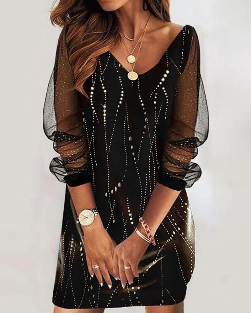 Style:Casual,Chic Type:Straight Material:Polyester Neckline:V-Neck Sleeve Style:Long Sleeve Length:Mini Pattern Type:Graphic Decoration:Sheer Mesh Fit Type:Regular Occasion:Daily Package Include:1* Dress