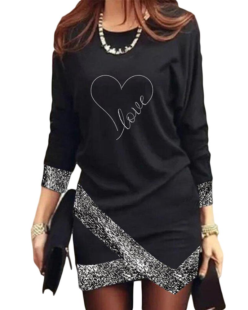 Style:Casual,Chic Type:T-shirt Material:Polyester Neckline:Round Neck Sleeve Style:Long Sleeve Length:Mini Pattern Type:Heart,Letter,Graphic,Contrast Paneled Decoration:Rhinestone,Contrast Binding Fit Type:Regular Occasion:Daily Package Include:1* Dress