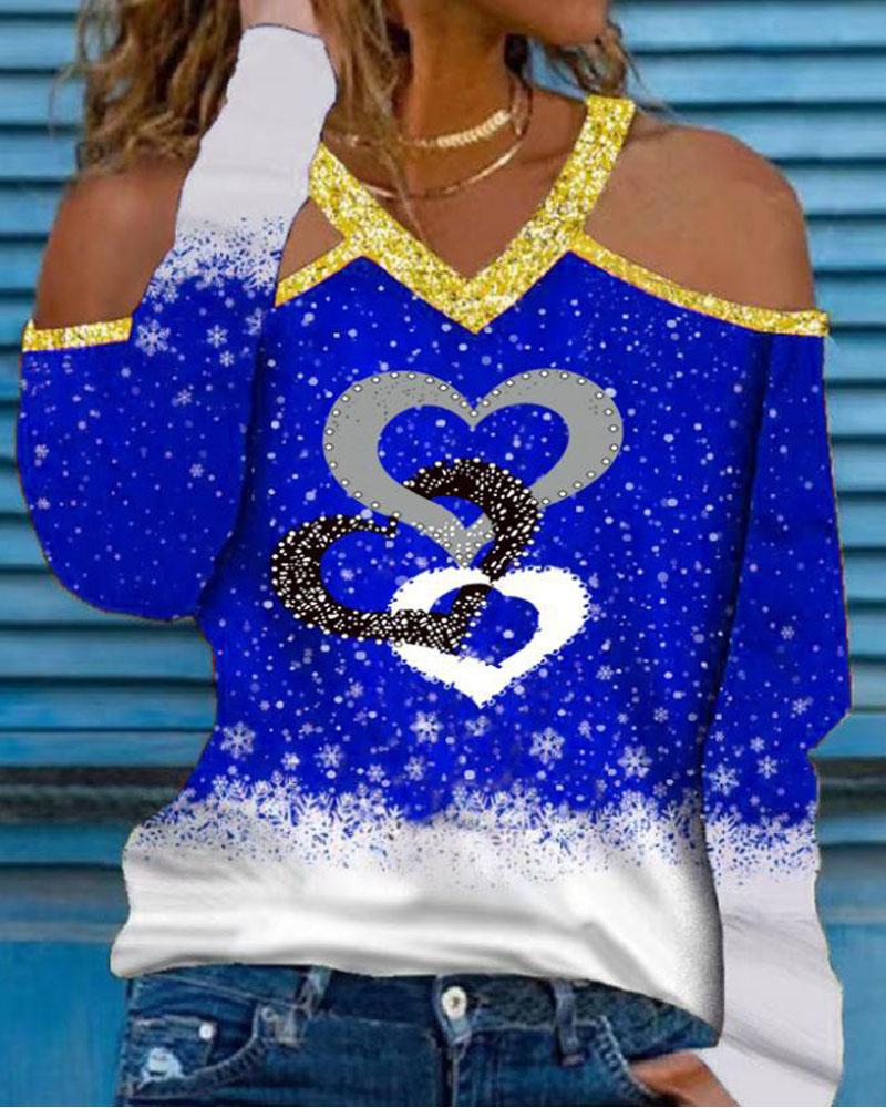 Christmas Snowflake Heart Print Cold Shoulder Top
