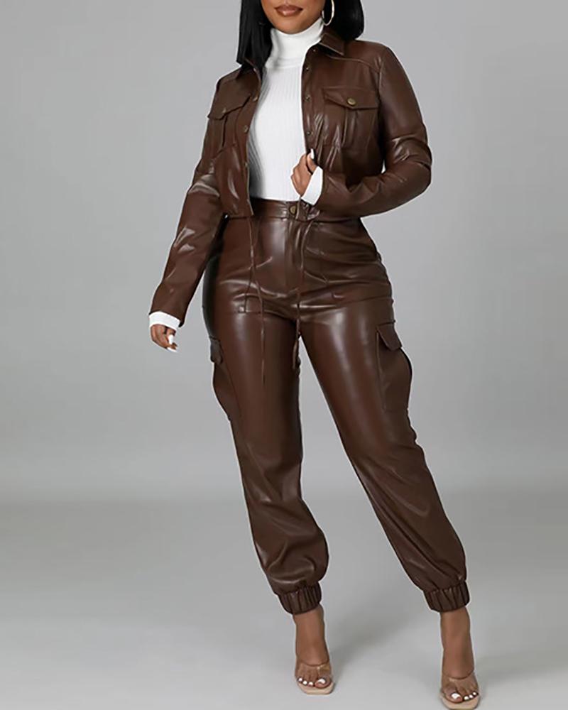 Style:Chic Type:Pants Sets Material:PU Leather Neckline:Turn-down Collar Sleeve Style:Long Sleeve Length:Long Pattern Type:Plain Decoration:Pocket Fit Type:Regular Occasion:Daily Package Include:Pants Sets