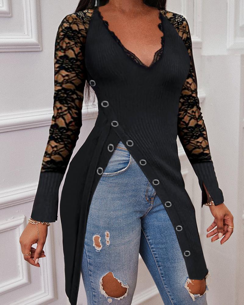 Style:Chic Type:Tee Material:Polyester Neckline:V-Neck Sleeve Style:Long Sleeve Length:Long Pattern Type:Plain Decoration:Button,Slit,Contrast Lace Fit Type:Regular Occasion:Daily Package Include:1*T-Shirt