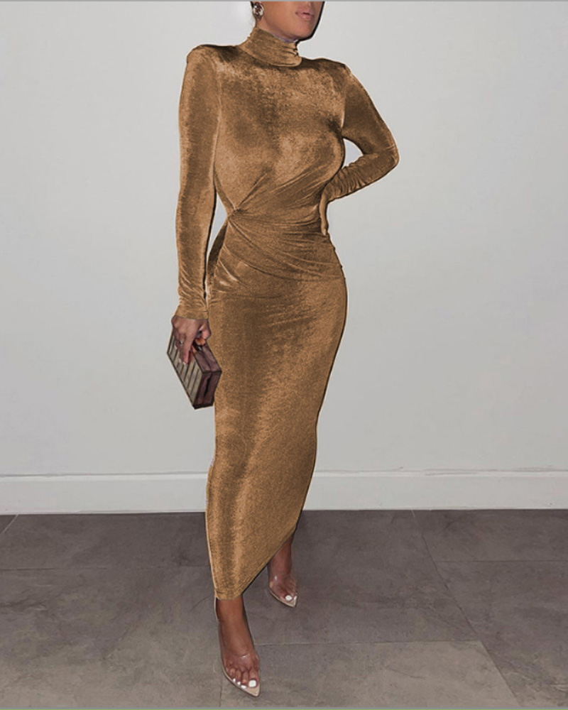 Style:Chic Type:Bodycon Material:Polyester Neckline:Mock Neck Sleeve Style:Long Sleeve Length:Maxi Pattern Type:Plain Decoration:Ruched Fit Type:Skinny Occasion:Party Package Include:1* Dress