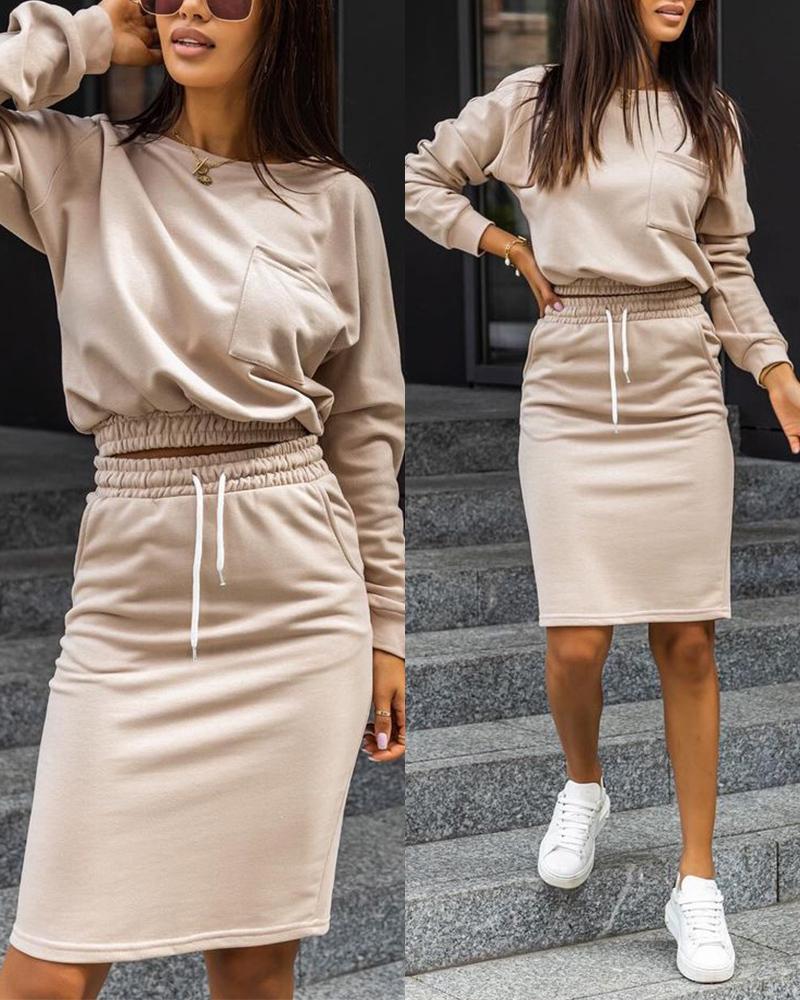 Style:Casual Type:Skirt Sets Material:Polyester Neckline:Round Neck Sleeve Style:Long Sleeve Length:Midi Pattern Type:Plain Decoration:Drawstring,Pocket,Shirred Fit Type:Regular Occasion:Daily Package Include:Skirt Sets