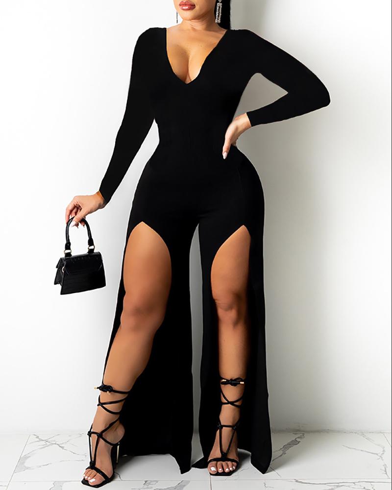 Style:Sexy Type:Jumpsuit Material:Polyester Neckline:V-Neck Sleeve Style:Long Sleeve Length:Long Pattern Type:Plain Decoration:Slit Fit Type:Regular Occasion:Night Out Package Include:1*Jumpsuit