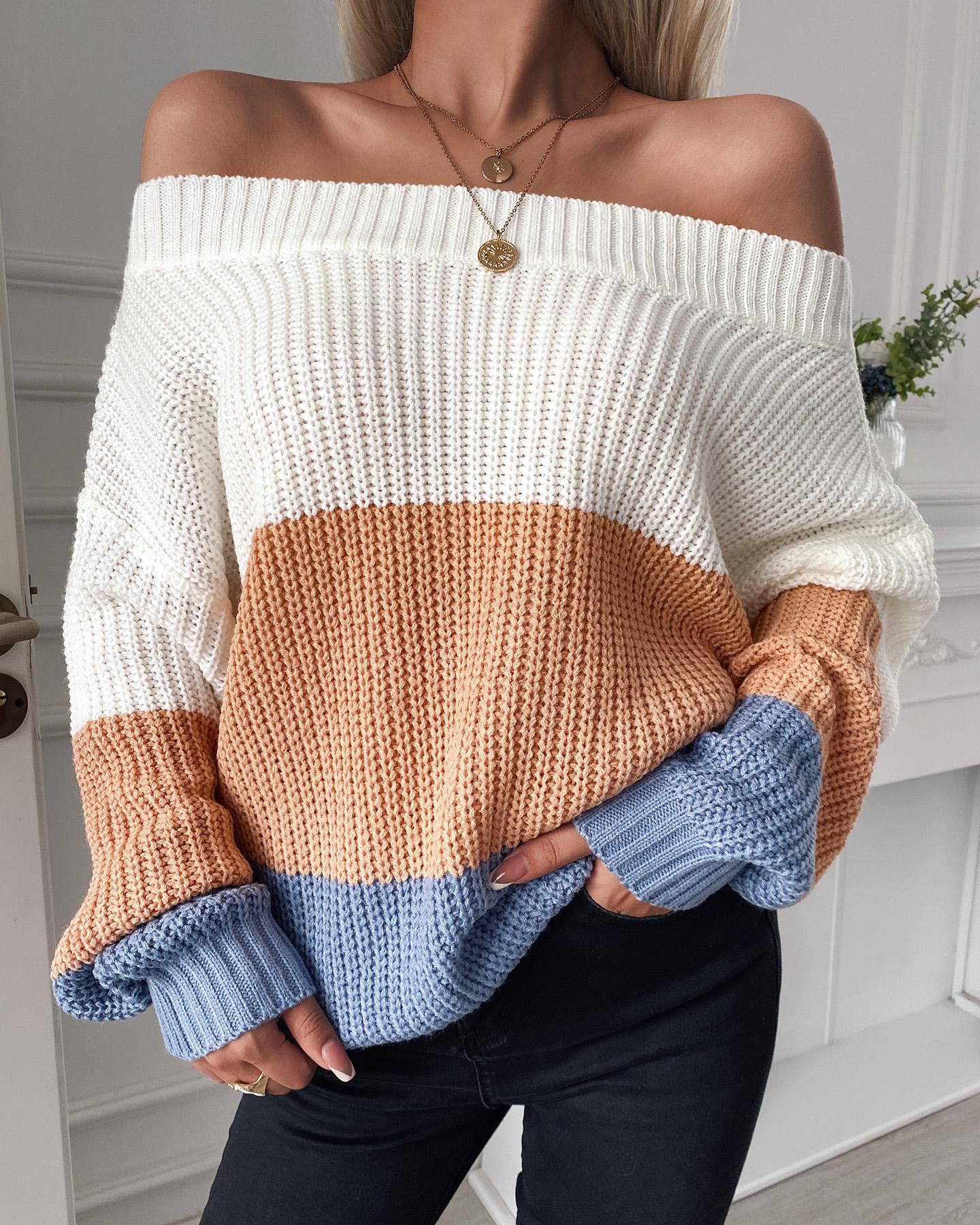 Style:Chic Type:Sweater Material:Acrylic Neckline:Off the Shoulder Sleeve Style:Long Sleeve Length:Regular Pattern Type:Colorblock Decoration:Chunky Knit Fit Type:Regular Occasion:Daily Package Include:1*Sweater