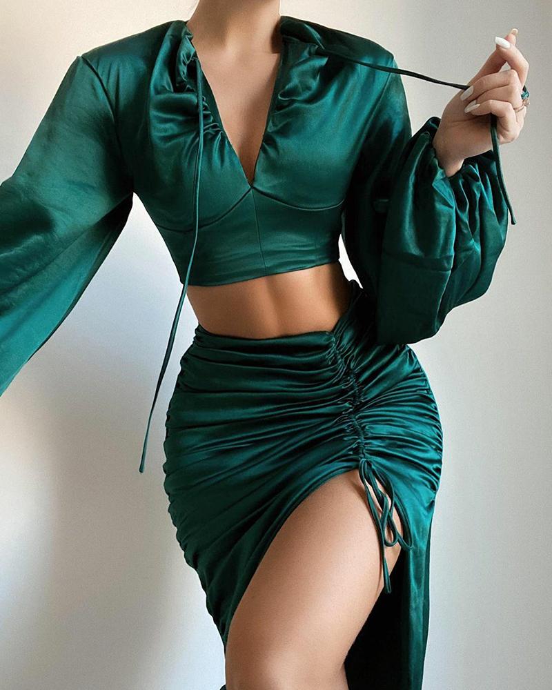 Lantern Sleeve Crop Top & Drawstring Ruched Slit Skirt Set