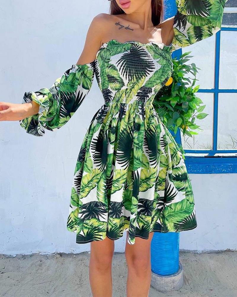 Style:Casual,Chic Type:A Line Material:Polyester Neckline:Off the Shoulder Sleeve Style:Long Sleeve Length:Above Knee Pattern Type:Tropical Decoration:Frill Hem Fit Type:Regular Occasion:Daily Package Include:1* Dress