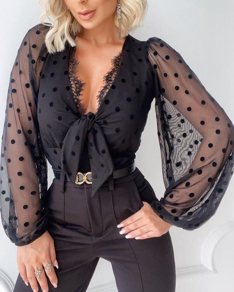 Polka Dot Mesh Sleeve Contrast Lace V-Neck Knot Front Blouse