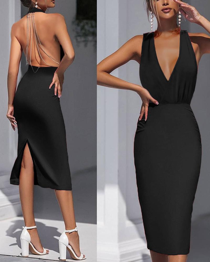 Style:Casual,Chic Type:Bodycon Material:95%Polyester,5%Elastane Neckline:V-Neck Sleeve Style:Sleeveless Length:Knee-Length Pattern Type:Plain Decoration:Slit Fit Type:Regular Occasion:Party Package Include:1* Dress