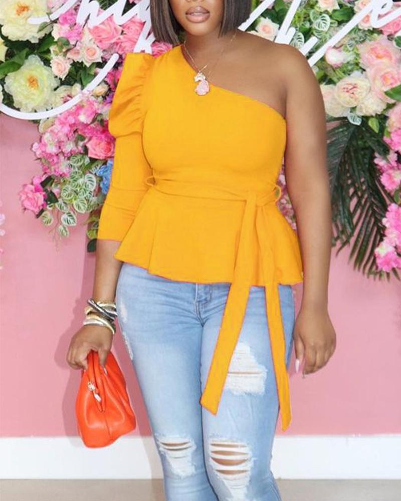 One Shoulder Puff Sleeve Self Tie Peplum Top