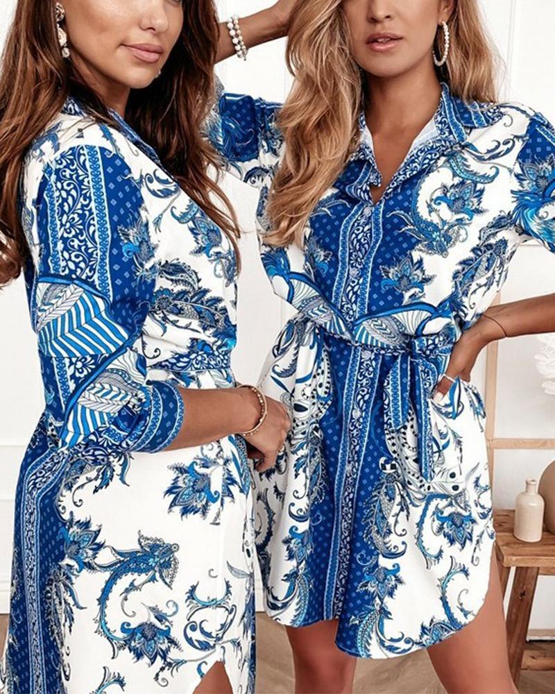 Floral Print Button Up Belted Shirt Dress
