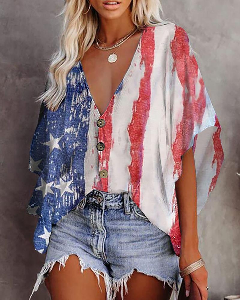 Style:Chic Type:Tee Material:Polyester Neckline:V-Neck Sleeve Style:Half Sleeve Length:Regular Pattern Type:Graphic Decoration:Batwing Sleeve,Button Fit Type:Regular Occasion:Daily Package Include:1*T-Shirt