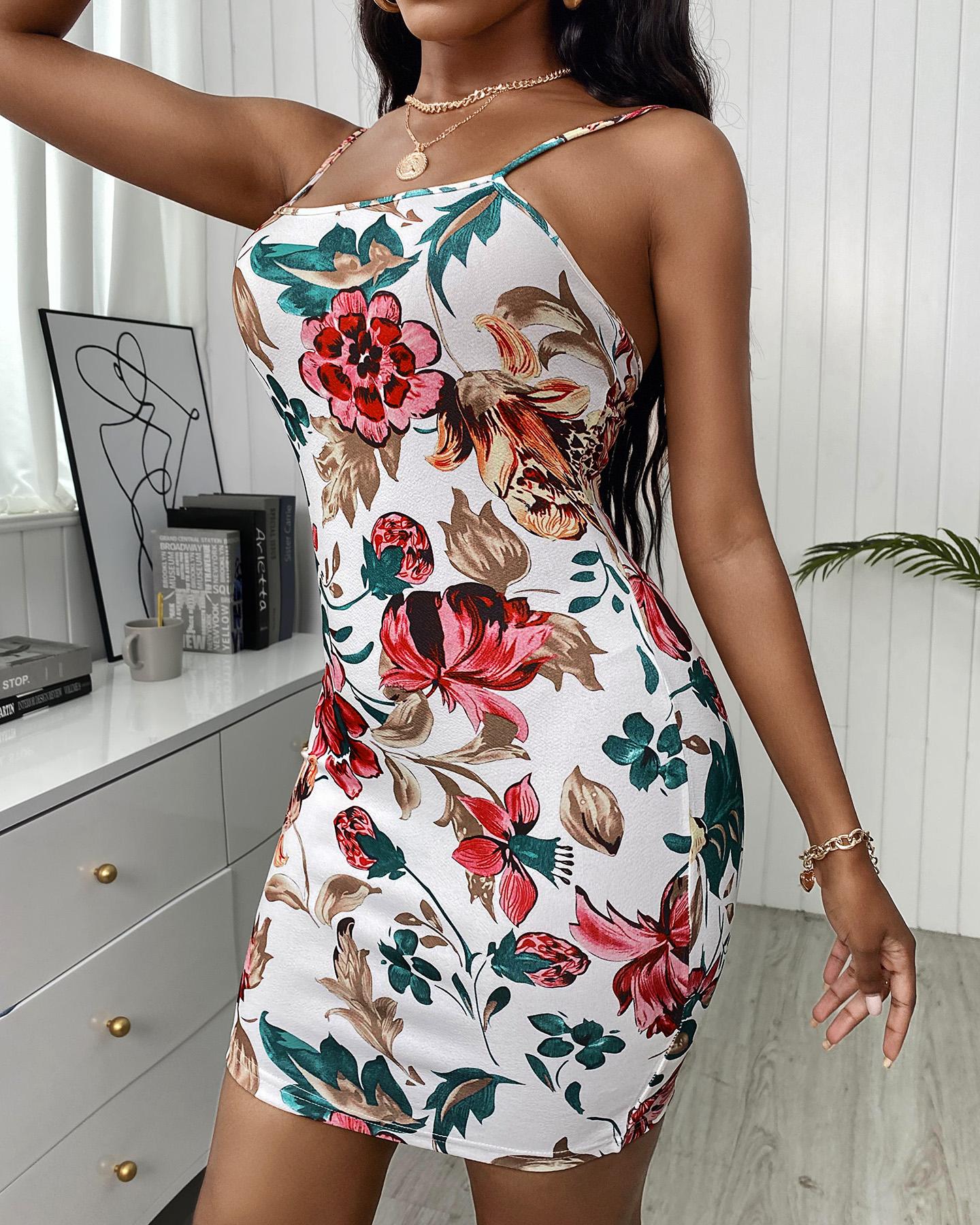 Style:Chic Type:Bodycon Material:Polyester Neckline:Square Neck Sleeve Style:Spaghetti Strap Length:Mini Pattern Type:Floral Decoration:Backless Fit Type:Skinny Occasion:Daily Package Include:1* Dress