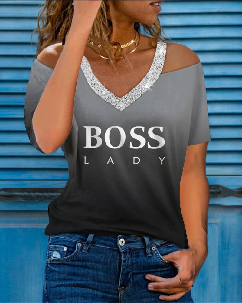 Style:Chic Type:Tee Material:95%Polyester,5%Elastane Neckline:Cold Shoulder Sleeve Style:Short Sleeve Length:Regular Pattern Type:Letter,Studded Fit Type:Regular Occasion:Daily Package Include:1*T-Shirt