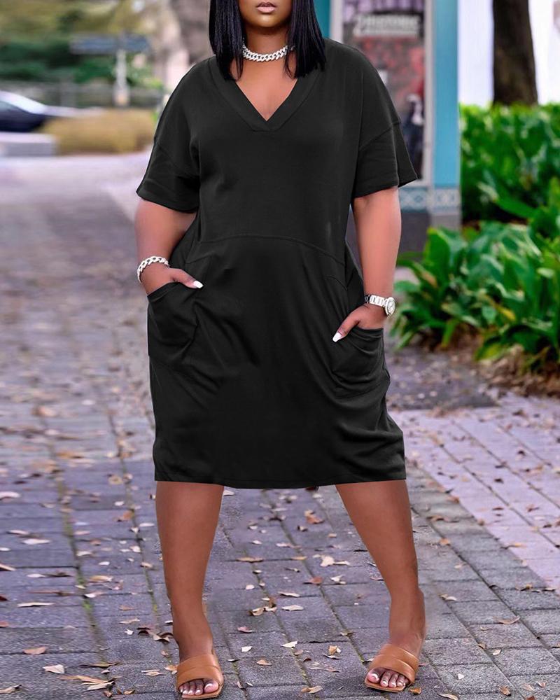 Style:Casual Type:Straight Material:Polyester Neckline:V-Neck Sleeve Style:Short Sleeve Length:Midi Pattern Type:Plain Decoration:Pocket Fit Type:Regular Occasion:Daily Package Include:1*Dress