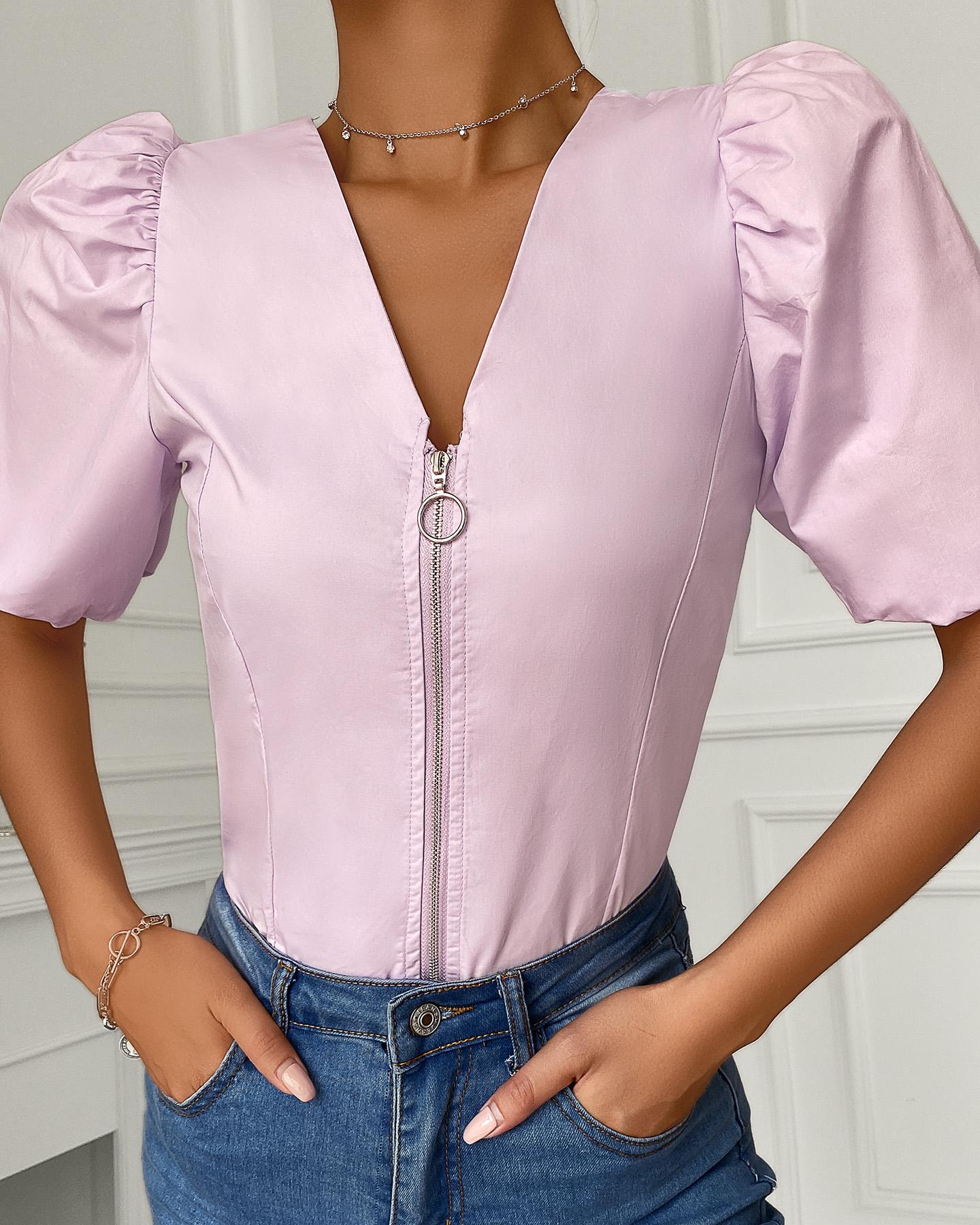 Style:Chic Type:Blouses Material:Polyester Neckline:V-Neck,Square Neck Sleeve Style:Half Sleeve Length:Regular Pattern Type:Plain Decoration:Puff Sleeve,Shirred,Zipper Fit Type:Regular Occasion:Daily Package Include:1* Blouse