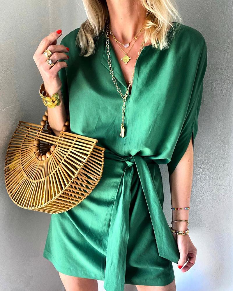 Style:Casual Type:A Line Material:Polyester Neckline:Stand Sleeve Style:Half Sleeve Length:Regular Pattern Type:Plain Decoration:Tied Detail Fit Type:Regular Occasion:Daily Package Include:1* Dress