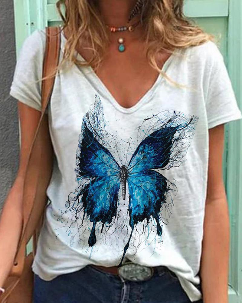 Butterfly Print Short Sleeve V-Neck Casual T-shirt