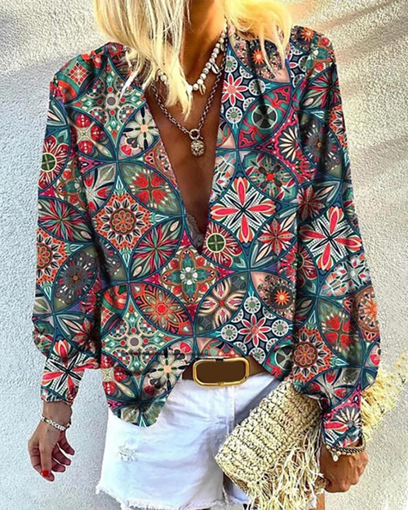 Style:Chic Type:Shirt Material:Polyester Neckline:Plunge Sleeve Style:Long Sleeve Length:Regular Pattern Type:Graphic Decoration:Lantern Sleeve Fit Type:Regular Occasion:Daily Package Include:1*Shirt