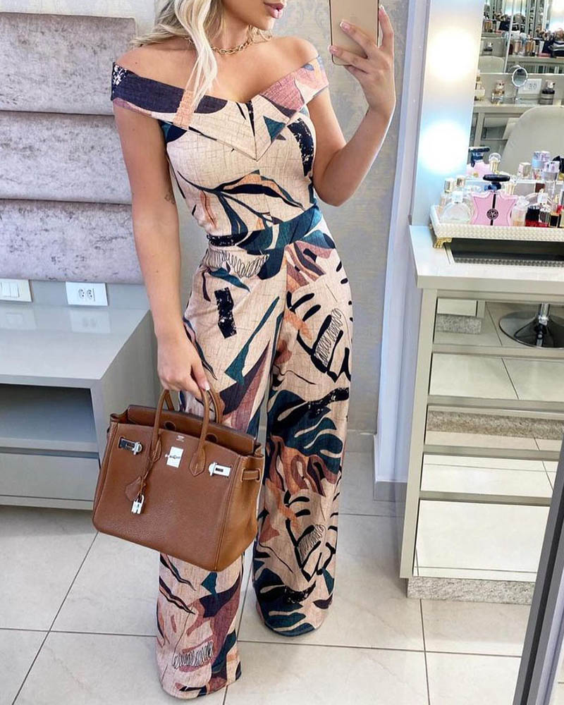 Style:Chic Type:Wide Leg Material:95%Polyester,5%Elastane Neckline:Off the Shoulder Sleeve Style:Short Sleeve Length:Long Pattern Type:Tropical Decoration:Random Print Fit Type:Regular Occasion:Daily Package Include:1*Jumpsuit