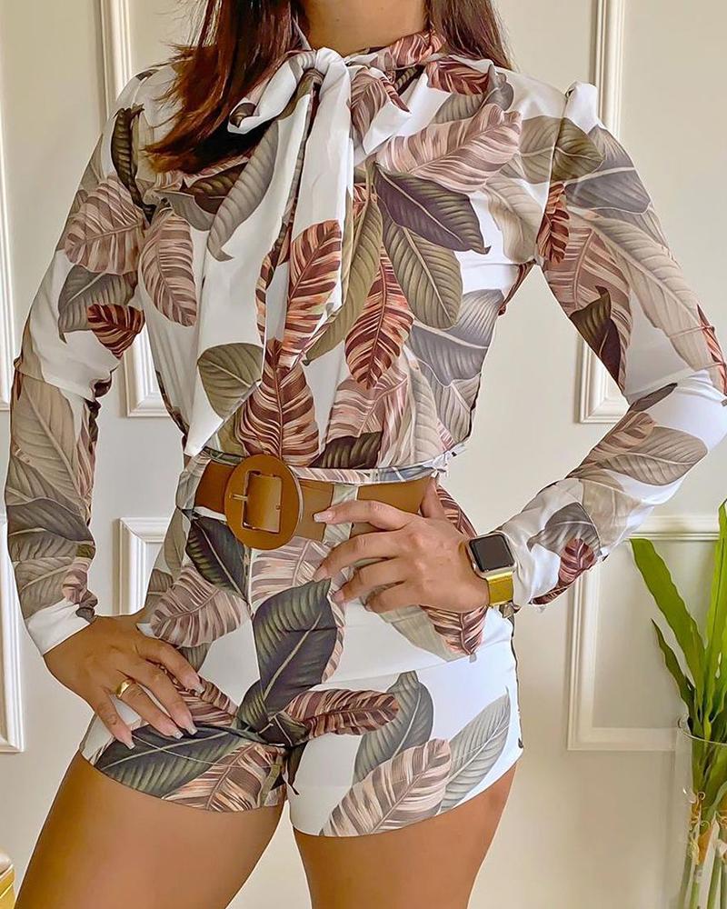 Tropical Print Tie Neck Long Sleeve Top & Shorts Set