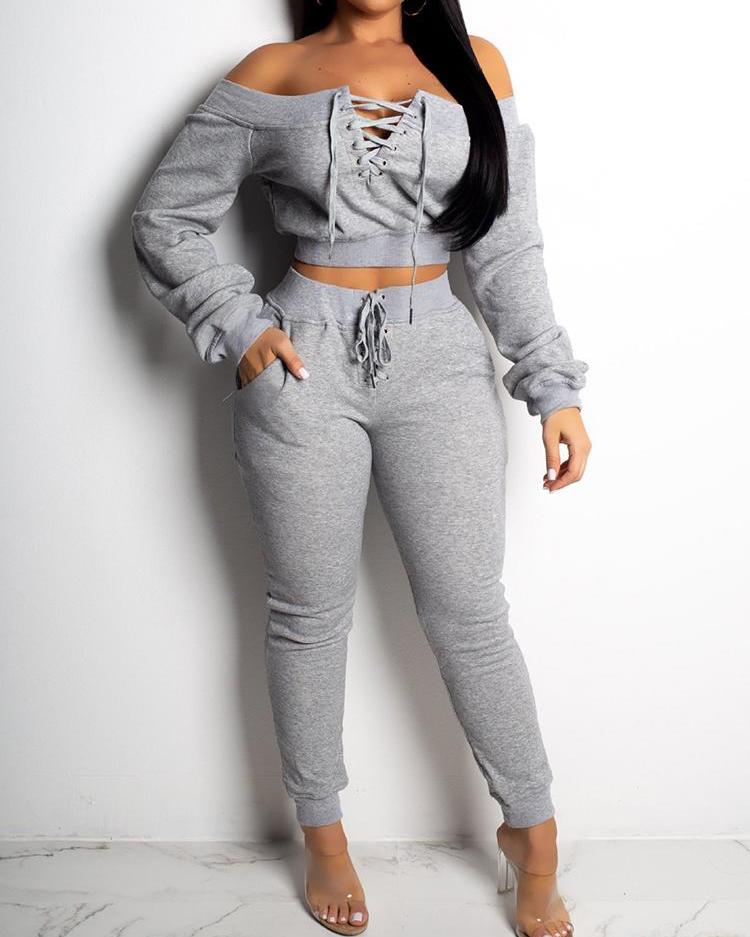 Lace-Up Design Off Shoulder Sweatshirt & Pant Sets