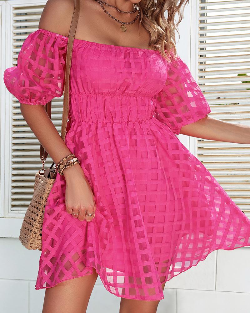 Style:Chic Type:Flared Material:Polyester Neckline:Off the Shoulder Sleeve Style:Half Sleeve Length:Midi Pattern Type:Plain,Plaid Decoration:Sheer Mesh Fit Type:Regular Occasion:Daily Package Include:1* Dress Fabric Elasticity:Non-Stretch Sleeve Type:Puff Sleeve Sheer:Semi-Sheer Care Instructions:Machine wash or professional dry clean