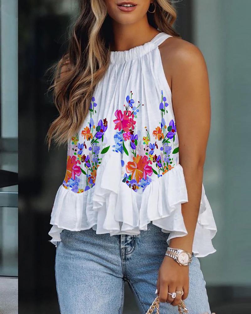 Style:Casual,Chic Type:Tank Material:97%Polyester,3%Elastane Neckline:O-neck Sleeve Style:Sleeveless Length:Regular Pattern Type:Floral Decoration:Ruffles Fit Type:Regular Occasion:Daily Package Include:1*Top Fabric Elasticity:Slight Stretch Sheer:No Care Instructions:Machine wash or professional dry clean
