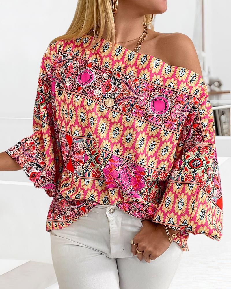 Style:Boho,Casual,Vintage Type:Blouses Material:97%Polyester,3%Elastane Neckline:Skew Neck Sleeve Style:Lantern Sleeve,Long Sleeve Length:Regular Pattern Type:Tribal Decoration:Lantern Sleeve Fit Type:Oversized Occasion:Daily,Vacation Package Include:1* Blouse Fabric Elasticity:Slight Stretch Sheer:No Care Instructions:Machine wash or professional dry clean