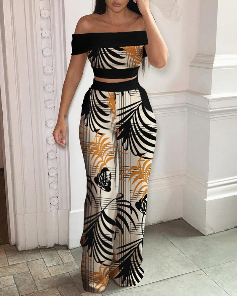 Style:Casual,Chic Type:Pants Sets Material:95%Polyester,5%Elastane Neckline:Off the Shoulder Sleeve Style:Short Sleeve Length:Long Pattern Type:Tropical Fit Type:Regular Occasion:Daily Package Include:Pants Set