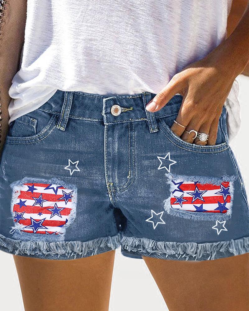 Independence Day Flag Print Patchwork Raw Hem Denim Shorts